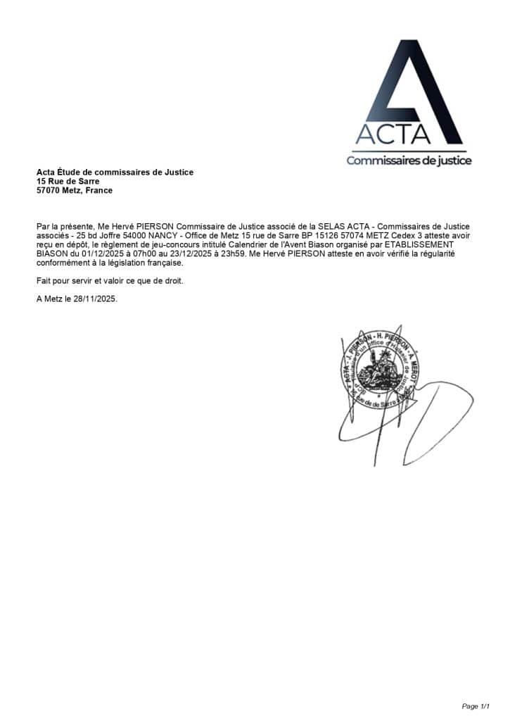 La SAS ETABLISSEMENT BIASON au capital de 400 000 €, ci-après désignée sous le nom « L’organisatrice », dont le siège social est situé ZONE D’ACTIVITES DU PONT LONG II, RUE DU VALENTIN 64121 SERRES-CASTET, immatriculée sous le numéro RCS Pau 330335571, organise un jeu gratuit sans obligation d’achat du 01/12/2025 à 07h00 au 23/12/2025 à 23h59.